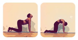 Cow/cat sequence is great for waking up the body, increasing joint circulation and lengthening the spine. It can be done alone first thing in the morning or before going to bed.